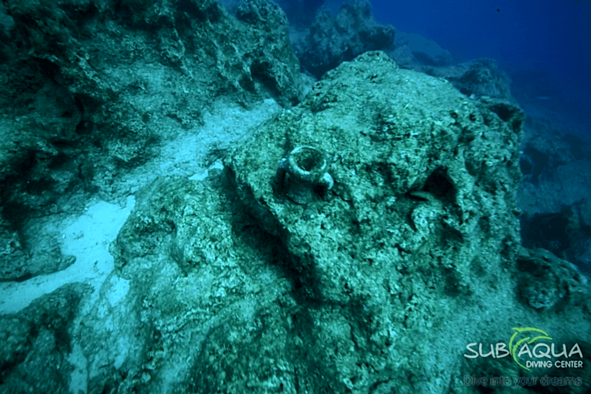 Ancient amphora fragments dating back to the 2nd and 3rd centuries AD — visible along the reef wall.